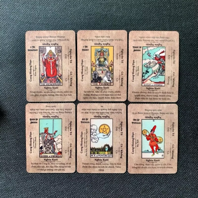 Bộ bài Tarot Tiếng Việt gồm 78 lá bài được thiết kế với hình ảnh sống động, giàu biểu tượng, phù hợp cho cả những người mới bắt đầu học tarot và những ai muốn khám phá thêm về ý nghĩa của từng lá bài. Bộ bài bao gồm 22 lá Ẩn Chính (Major Arcana) và 56 lá Ẩn Phụ (Minor Arcana), cung cấp một hệ thống toàn diện để giải mã thông điệp từ tiềm thức và vũ trụ.