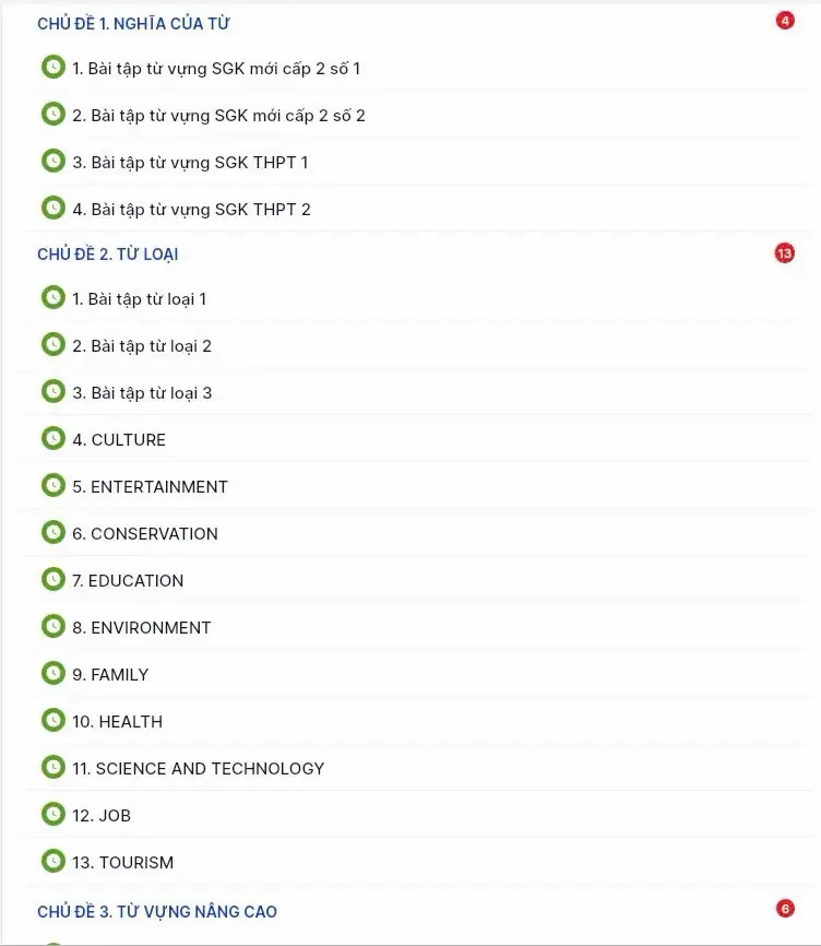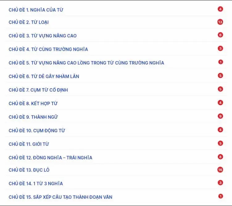 Như vậy, có thể thấy bên cạnh các phạm trù từ vựng cơ bản như nghĩa của từ, từ loại, đồng nghĩa- trái nghĩa, giới từ… thì còn có các phạm trù 9+ như từ vựng nâng cao, thành ngữ, từ cùng trường nghĩa, từ vựng nâng cao lồng trong từ cùng trường nghĩa, từ dễ gây nhầm lẫn, cụm động từ nâng cao, kết hợp từ, cụm từ cố định.
