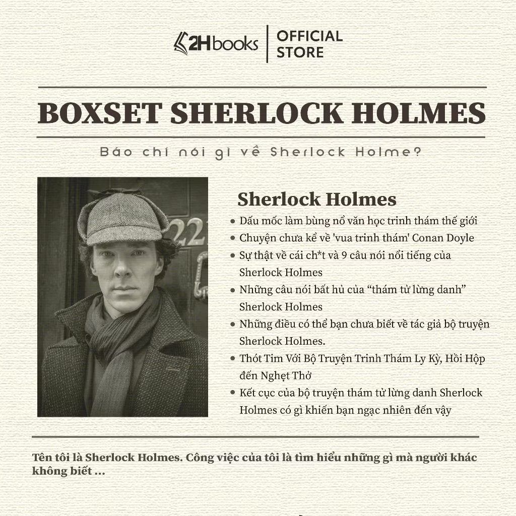 Nhân vật Sherlock Holmes từ lâu đã trở thành nguồn cảm hứng cho hàng trăm, hàng ngàn tác phẩm ở nhiều loại hình nghệ thuật khác: từ âm nhạc, ca kịch đến điện ảnh… Bộ sách Sherlock Holmes toàn tập (boxset trọn bộ 3 tập) một lần nữa mang đến cho người đọc cơ hội được nhìn ngắm, ngưỡng mộ và đánh giá nhân vật độc đáo của nhà văn tài năng Conan Doyle. Chân dung cuộc đời, sự nghiệp và nhân cách của Sherlock Holmes chưa bao giờ được tái hiện chân thực, đầy đủ và sống động đến thế… Chỉ từ một giọt nước, người giỏi suy luận có thể đoán ra rất nhiều chuyện liên quan đến một thác nước hay một đại dương dù họ chưa bao giờ tận mắt nhìn thấy chúng. Như vậy, cuộc sống là một chuỗi mắt xích rộng lớn nhất của nó, nếu ta biết được một mắt xích. Như tất cả mọi khoa học khác, “suy đoán và phân tích” là một khoa học mà ta chỉ có thể làm chủ nó sau một quá trình nghiên cứu dài lâu, bền bỉ.