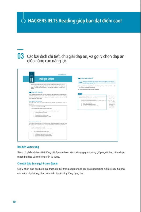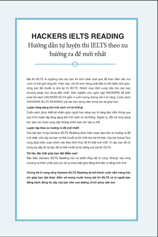 - Hackers IELTS Reading - Cuốn sách được thiết kế nhằm giúp người học nâng cao kỹ năng đọc hiểu thông qua quá trình luyện tập từng dạng bài một cách có hệ thống. Ngoài ra, đối với từng dạng bài, bạn còn được cung cấp những chiến lược làm bài cụ thể. Các bài đọc trong Hackers IELTS Reading được biên soạn dựa trên xu hướng ra đề mới nhất, nhờ vậy mà bạn có thể chuẩn bị tốt cho bài thi thật. Các bài Actual Test cũng được biên soạn chính xác theo hình thức đề thi thật mới nhất. Đặc biệt, Hackers IELTS Reading còn có phần tổng kết từ vựng "khủng" sau từng chương trình và thêm phần phụ lục về sự khác biệt giữa tiếng Anh Mỹ và tiếng Anh Anh.