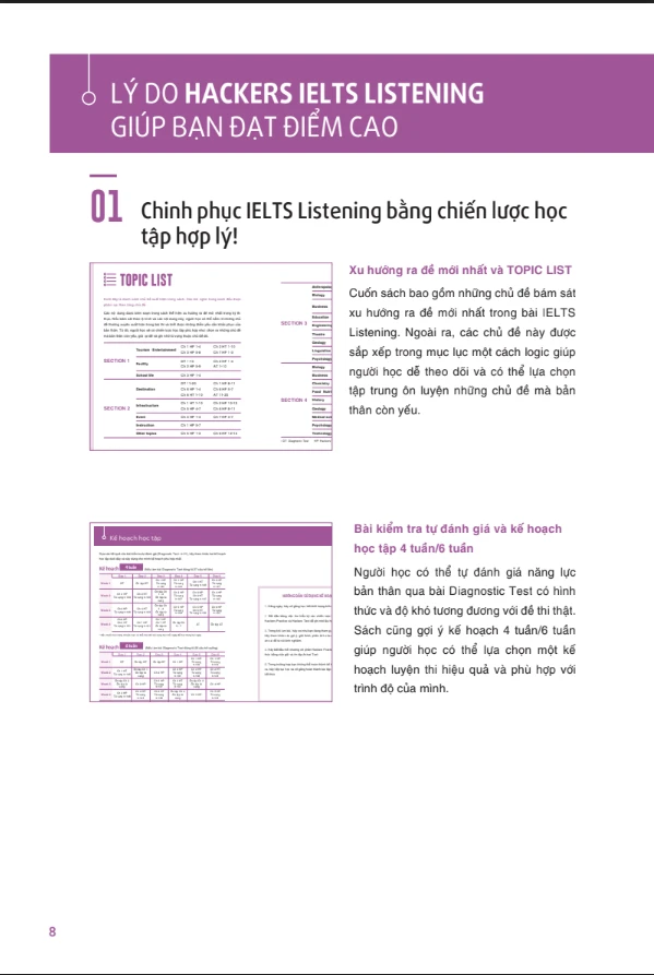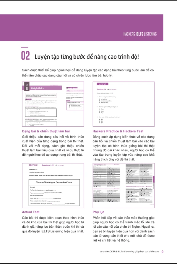 - Hackers IELTS Listening - Các bài nghe trong Hackers IELTS Listening được biên soạn dựa trên xu hướng ra đề mới nhất, các bài Actual Test cũng được biên soạn chính xác theo hình thức giống hệt đề thi thật. Vì vậy, bạn đã có đầy đủ trong tay tài liệu để có thể chuẩn bị kỹ lưỡng cho phần thi của mình. Sách cung cấp các tài liệu như: Hỏi - đáp về phương pháp ghi chú khác biệt giữa tiếng Anh - Anh và tiếng Anh - Mỹ, từ vựng theo chủ đề và bài luyện tập chép chính tả nhằm giúp người học ôn luyện hiệu quả và đạt được mục tiêu của mình.