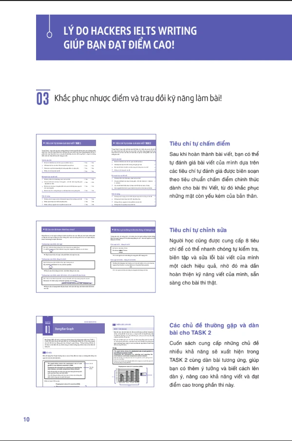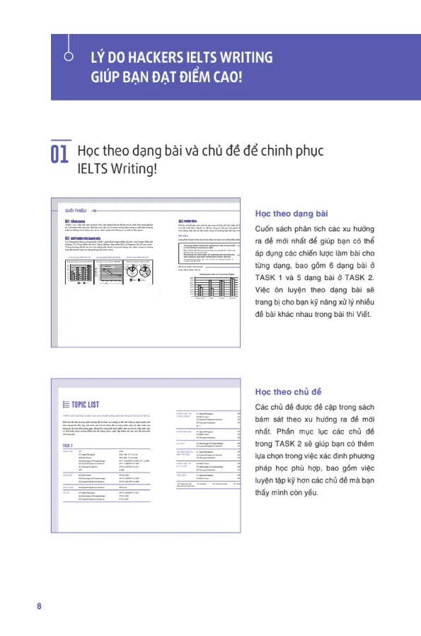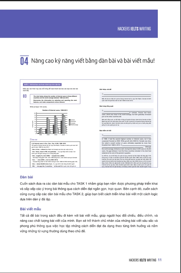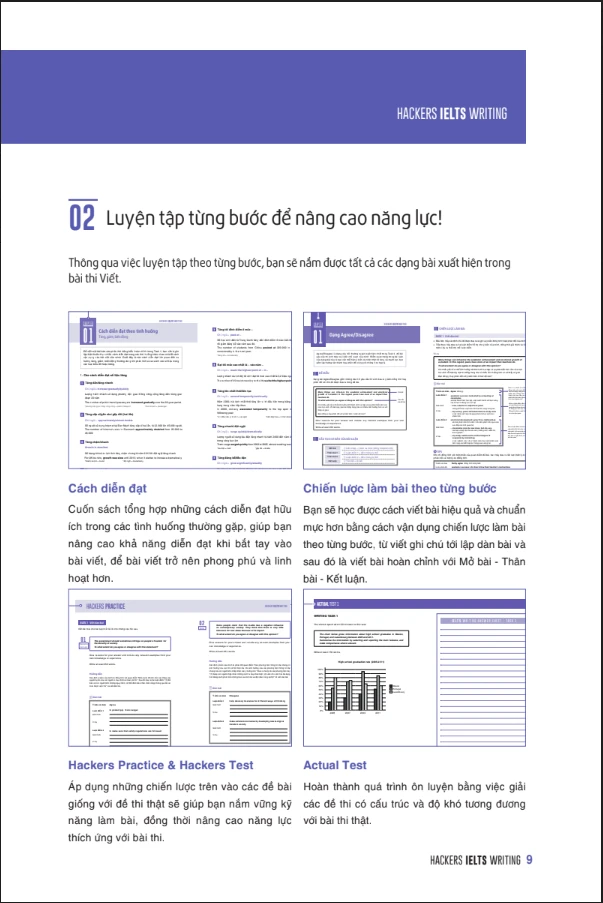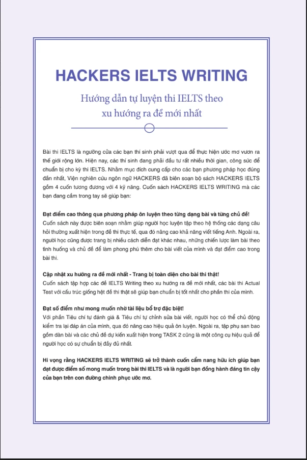 - Hackers IELTS Writing - Cuốn sách được biên soạn nhằm giúp người học luyện tập theo hệ thống các dạng câu hỏi thường xuất hiện trong đề thi thực tế, qua đó nâng cao kỹ năng viết tiếng Anh. Ngoài ra, người học cũng được trang bị nhiều cách diễn đạt khác nhau, những chiến lược làm bài theo chủ đề phong phú thêm cho bài viết của mình và đạt điểm cao trong bài thi. Cuốn sách tổng hợp các đề thi IELTS Actual Test với cấu trúc giống đề thi thật sẽ giúp bạn chuẩn bị tốt nhất cho phần thi của mình.