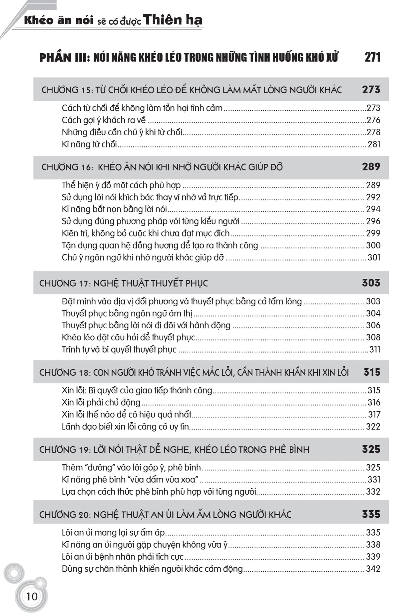 Trong cuộc sống thường ngày, chúng ta thấy rằng: Biết cách nói chuyện không nhất định là phải nói nhiều, quan trọng là phải nói đúng trọng tâm, đúng nội dung. Và điều quan trọng là phải nắm được vấn đề mình đang nói đến. Chắc chắn rất nhiều người đã gặp phải tình huống như thế này: Có những nhân viên tiếp thị khi gặp khách hàng thì giống như một cái máy, nói không ngừng nghỉ, không để ý tới phản ứng và cảm nhận của khách hàng, không cần biết vị khách đó có đang nghe lời giới thiệu về sản phẩm hay không. Nếu làm việc như vậy thì người đó nắm chắc phần thất bại. Trong cuộc sống và trong công việc, chúng ta cũng rất hay gặp phải hiện tượng như sau: Nhiều người khi nói chuyện với người quen thì nói rất hay, không bị mất bình tĩnh hay ấp úng. Thế nhưng khi gặp người lạ hoặc phải nói chuyện trong một đám đông, thì người đó dường như bị mất sự chủ động với ngôn ngữ, có lúc còn không biết mình đã nói gì. Vậy làm thế nào để cải thiện và tránh gặp phải những tình huống như trên? Làm thế nào để ăn nói khéo léo? Có phương pháp và quy luật nào được áp dụng khi giao tiếp không? Có nguyên tắc và bí quyết nào cho các cuộc nói chuyện không? Trong những tình huống khác nhau, với những người khác nhau thì phải nói chuyện như thế nào, và làm sao để trình bày những điều khó nói? Cuốn sách “Khéo ăn nói sẽ có được thiên hạ” này sẽ giải đáp những câu hỏi đó. Cuốn sách với ngôn từ rõ ràng, gần gũi với cuộc sống sẽ mang đến những kĩ năng và phương pháp giao tiếp thực dụng, chắc chắn sẽ giúp ích cho quý độc giả. Nếu như những quy tắc và phương pháp chỉ giúp một số ít người nắm được và ứng dụng, thì giá trị của nĩ là có hạn. Chỉ cần những quy tắc và phương pháp cuốn sách đưa ra giúp được nhiều người, thì giá trị của nó là vơ hạn. Tác giả của “Khéo ăn nói sẽ có được thiên hạ” đã dốc hết tâm sức nghiên cứu về các kĩ năng và quy tắc giao tiếp, đây cũng chính là giá trị lớn nhất của cuốn sách. Một cuốn sách hay sẽ tự nói lên được giá trị của nó, và tự bản thân mỗi độc giả sẽ cảm nhận được điều đó. Quý độc giả sẽ tự nhiên yêu thích một cuốn sách có thể chạm đến trái tim và bổ ích cho mình. Còn với một cuốn sách không hay, độc giả sẽ không mua và cũng sẽ không để tâm đến. Sự hay dở của một cuốn sách do chính độc giả cảm nhận và xác định, thị trường sách cũng sẽ có đánh giá. Cuối cùng, nhắc lại về vấn đề giao tiếp, tôi có hai điều muốn nói với độc giả: Thứ nhất là nói chuyện phải chân thành. Chân thành chính là thứ ngôn ngữ hay nhất, nếu không chân thành thì cho dù nói nhiều bao nhiêu, nắm được nhiều kĩ năng và phương pháp giao tiếp đến thế nào, tất cả cũng chỉ là vô nghĩa. Điều thứ hai là phải lắng nghe bằng trái tim. Chỉ có lắng nghe bằng trái tim thì chúng ta mới biết phải nói gì, nói như thế nào. Những người không biết cách lắng nghe thì không phải là người biết cách nói chuyện. Người biết cách nói chuyện thì chắc chắn là người biết lắng nghe. Chúc quý độc giả đọc sách vui vẻ và có thể nâng cao được kĩ năng giao tiếp của mình. Biết cách nói chuyện khéo léo và luôn có được cuộc sống tuyệt vời.