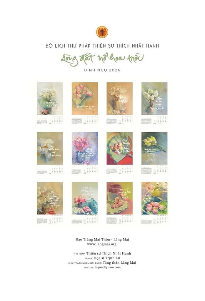 Năm nay, Tăng thân Làng Mai cùng Thái Hà Books trân trọng gửi đến bạn ấn phẩm lịch đặc biệt với chủ đề “Lòng đất nở hoa trời”. Mỗi tờ lịch không chỉ là một mốc thời gian, mà còn là một cánh cửa nhỏ dẫn về chánh niệm – nhắc ta dừng lại, thở sâu và sống thật.