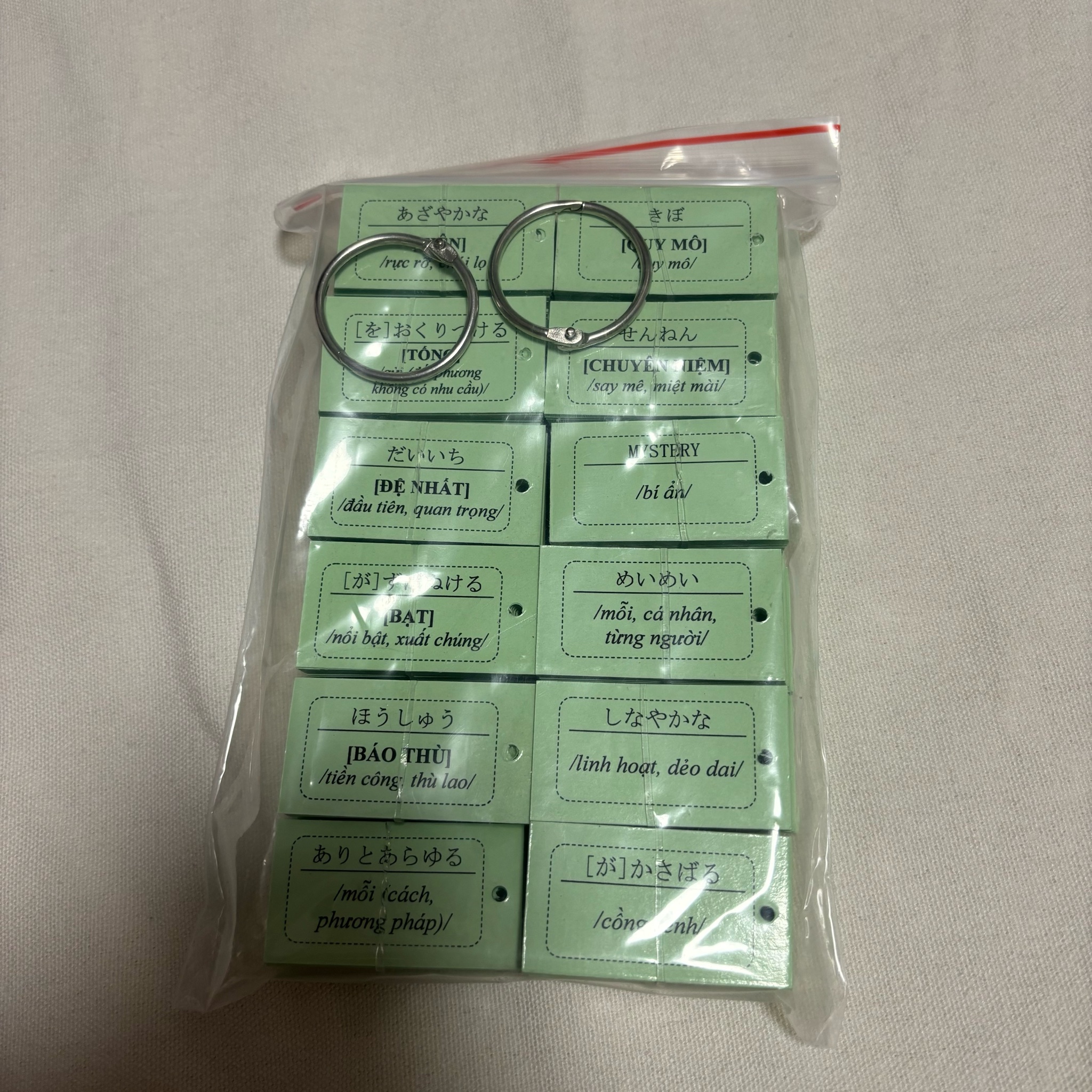 Flashcard gồm hai mặt : mặt trước là chữ Kanji, mặt sau có phiên âm theo Hiragana, âm Hán Việt và nghĩa của từ.
