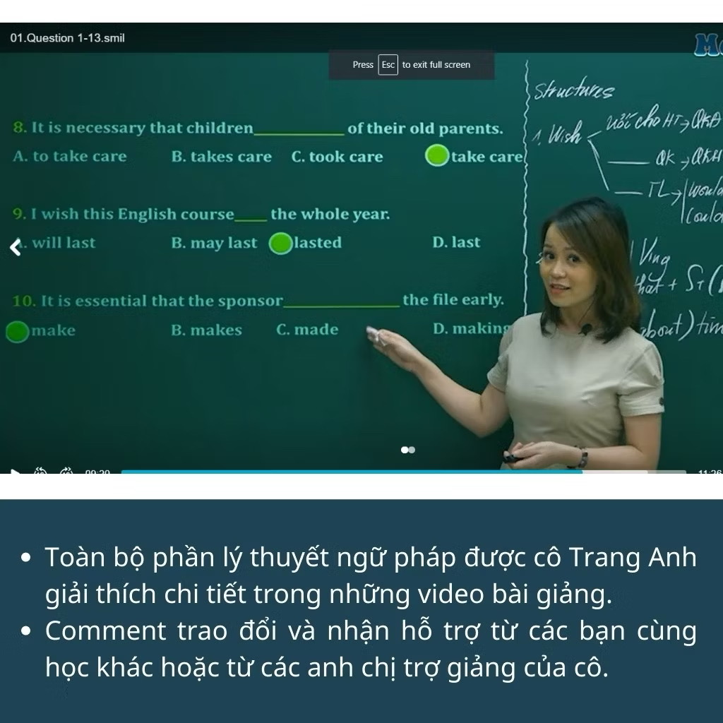 - Phần Grammar: Có video bài giảng các chuyên đề lý thuyết kèm minitest thực hành.